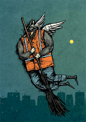 В четыре утра Калмамат встает, чтобы без очереди попасть в туалет и умыться (эта роскошь обходится ему в час сна). Через полчаса квартира уже будет стоять на ушах. В пять утра Калмамат должен быть на работе. Часов до двух он будет мести, собирать бычки, колоть лед ломиком или причесывать траву косилкой. Потом - «сидеть на подхвате»: обычно к двум часам на работу приезжает дама-начальница с внешностью медсестры из известного романа Кена Кизи и начинает пугать дворников очередной «комиссией». Вид сидящего на лавочке человека в робе ее возмущает: он не может отдыхать, по определению должен работать.