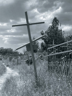 Русское кладбище, на котором произошел взрыв. Железные ворота, всегда закрытые - но не на замок, а на кусок толстой проволоки, чтобы люди могли ходить на кладбище, а коровы нет. Кресты частью деревянные, но больше железные, сваренные из водопроводных труб, выкрашенных ярко-голубой краской - той самой, которой на юге России так любят красить заборы и ворота.