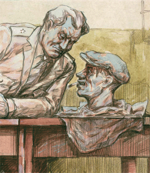 Пьяный парень Леха, задержанный вместе с ногайцем, поразительно похож на «художественный портрет». Пока ногаец, сидя в обезьяннике, причитал «Отпустите меня, у меня мама русская», Леху обыскали (в карманах— паспорт, сто рублей с мелочью, десяток презервативов Erotica super) и раздели. На ногах синяки, на спине шрамы. О происхождении синяков ничего сказать не может, о шрамах говорит, что они остались со времен второй чеченской кампании — Леха, по его словам, служил в ВДВ и воевал в Чечне.